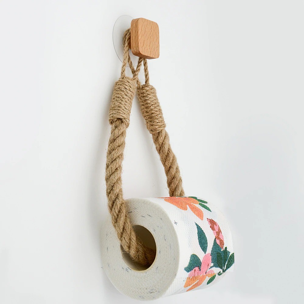 Suporte estiloso para toalha ou papel higiénico. Gancho de madeira onde se pendura a corda. O suporte é instalado através de uma ventosa. É muito resistente e dura muito tempo. Perfeita decoração para a sua casa de banho.