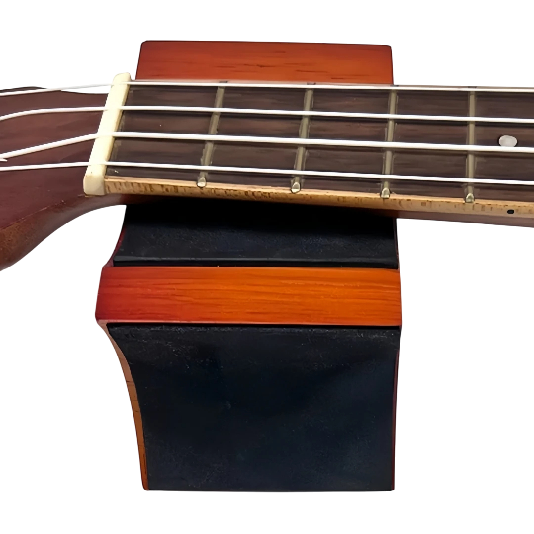 Suporte de pescoço estável em madeira vermelha para manutenção, reparos ou troca de cordas em guitarras elétricas e acústicas. Descrição completa