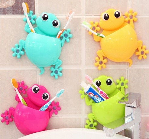 O suporte para escovas de dentes e pasta de dentes em forma de rã com ventosas pode ser fixado em qualquer lugar da casa de banho.