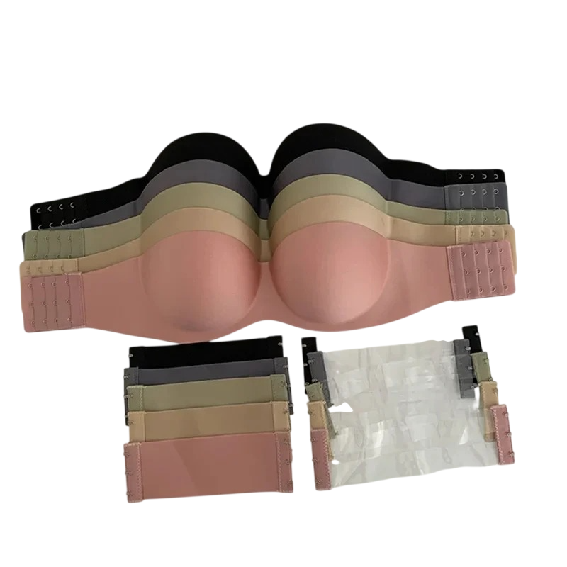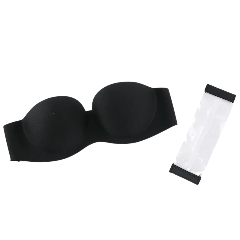 Sutiã auto-aderente sem alças feito de material elástico. Design liso adequado para vestidos e tops sem linhas visíveis. Descrição completa