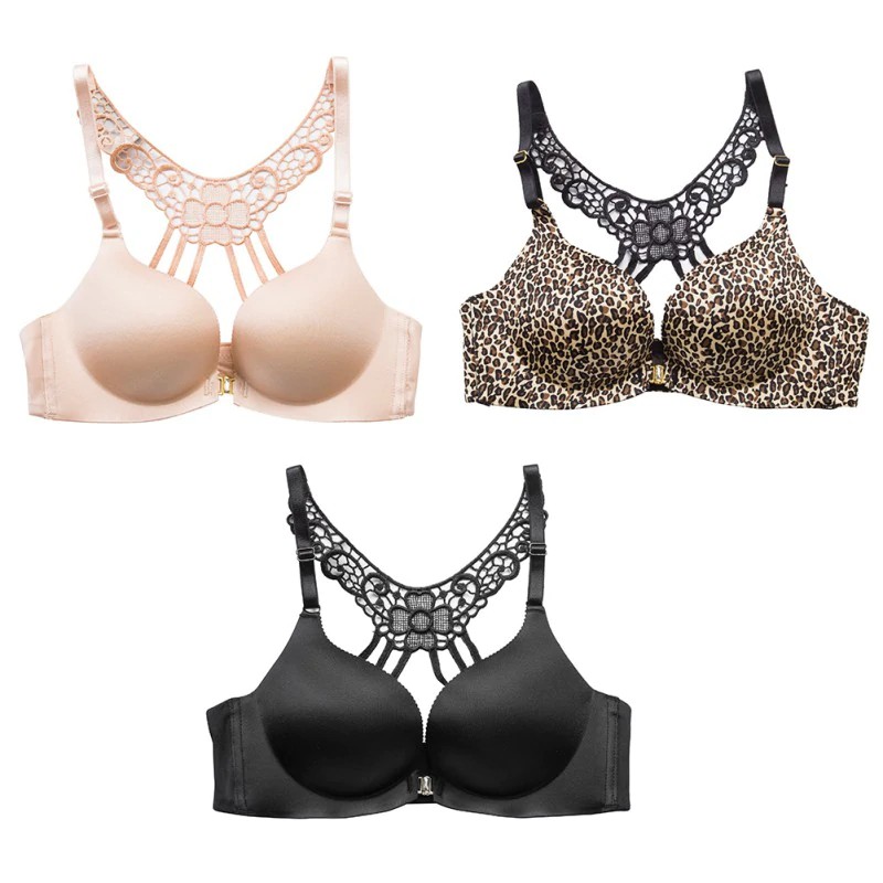 O sutiã fecha-se  à frente e a parte de trás é em renda com padrão de flores.