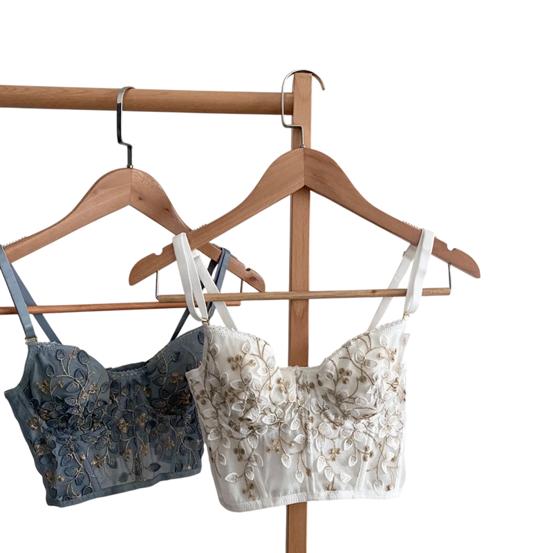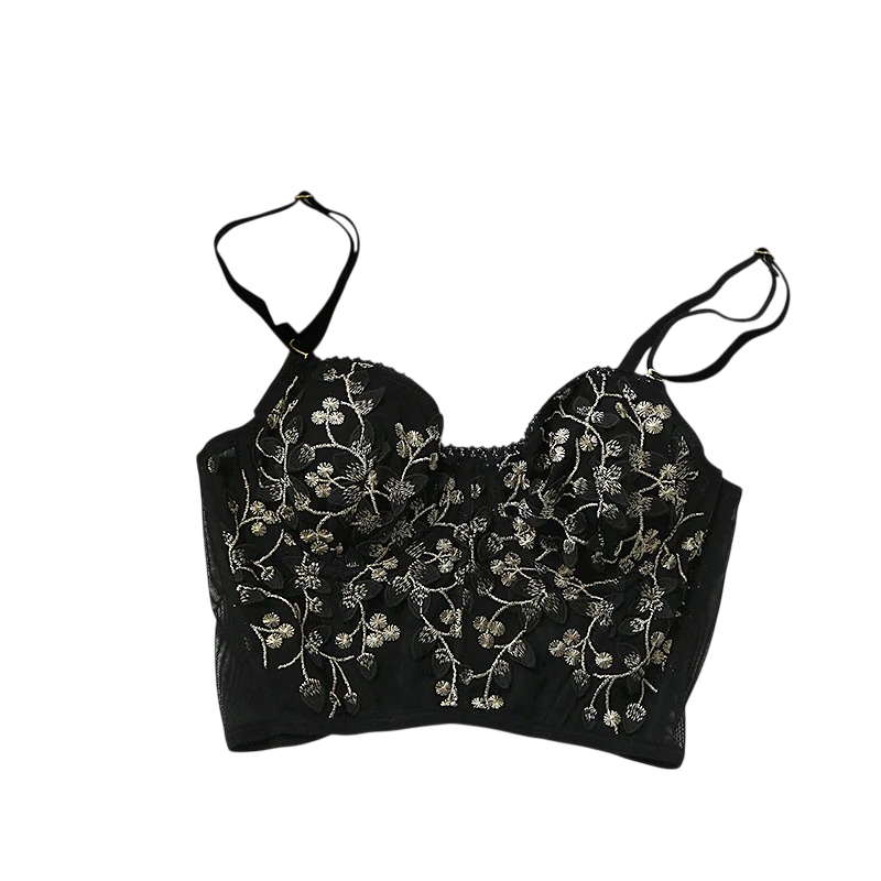 Sutiã de renda com detalhe bordado de uma combinação de materiais. Corte alongado e alças finas adequadas para uso diário. Descrição completa