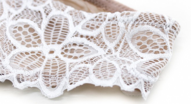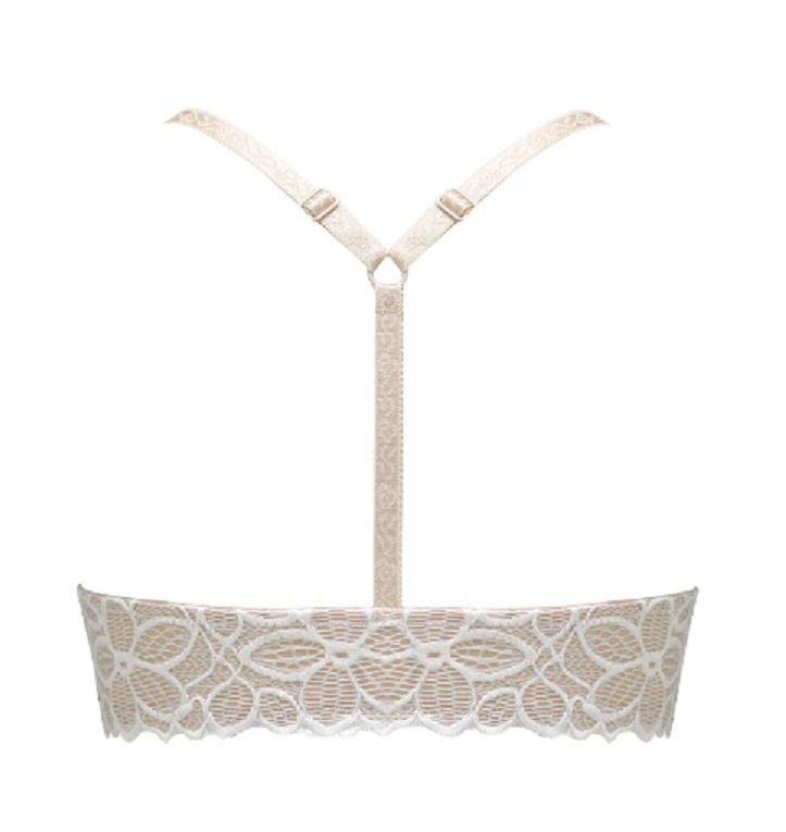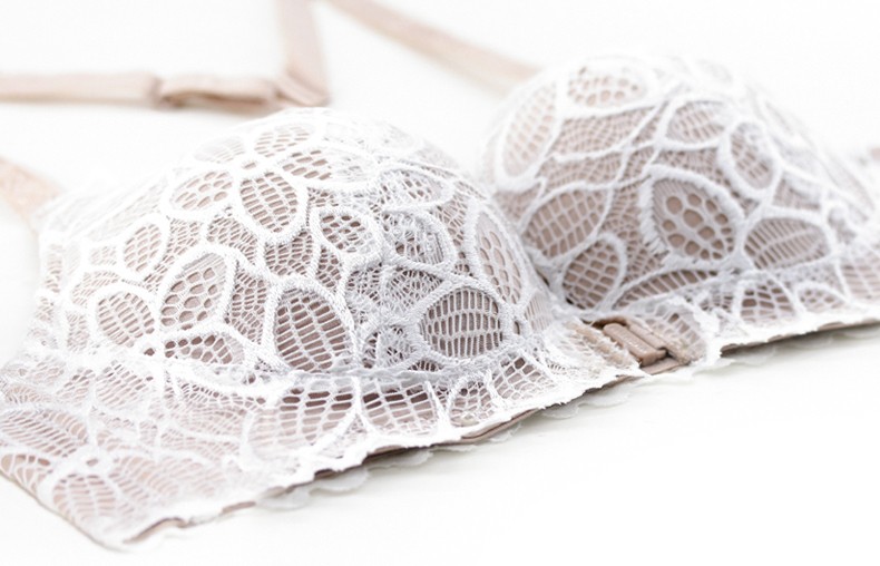 O sutiã é lindamente decorado com renda e tem alças ajustáveis.