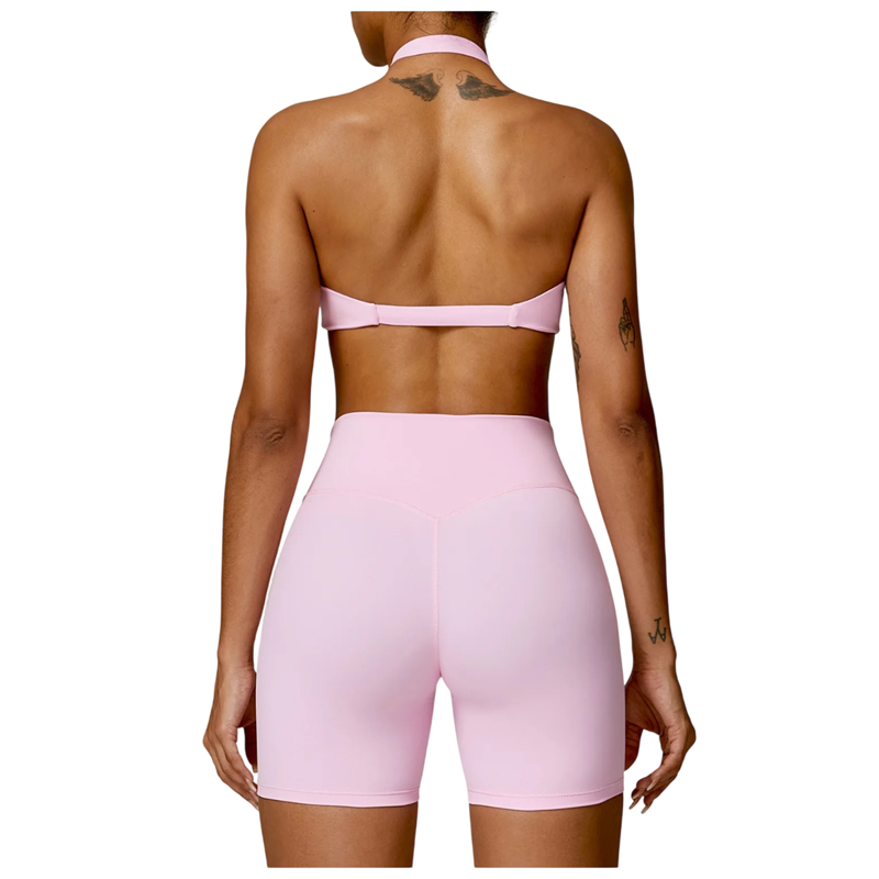 Sutiã desportivo com corte halter e material elástico, adequado para fitness, corrida e ioga, proporciona conforto em movimento. Descrição completa
