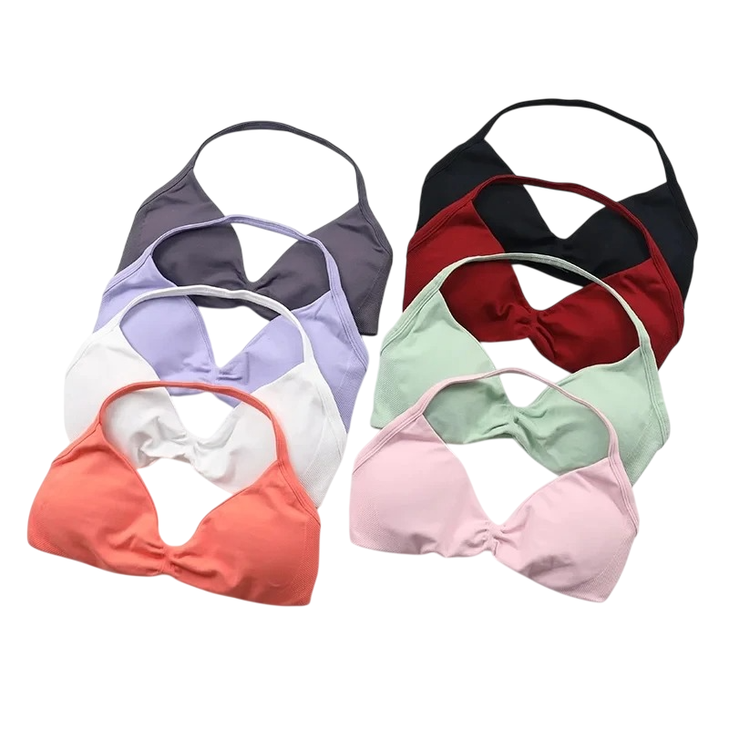 Sutiã desportivo com decote mais profundo e material elástico, adequado para fitness, corrida e exercício, garantindo conforto em movimento. Descrição completa