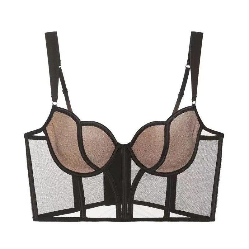 Sutiã feminino com design de rede transparente e corte alongado em poliéster e nylon, lingerie leve para uso diário