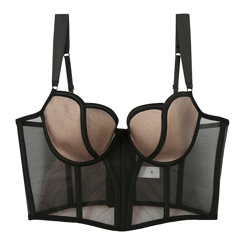 Página inicial Página inicial Roupa e acessórios Roupa de mulher Roupa interior de mulher Soutiens de mulher Soutiens push-up de mulher Sutiã feminino com design de rede transparente e corte alongado em poliéster e nylon, lingerie leve para uso diário