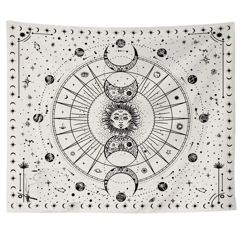 Esta estilosa tapeçaria boémia com motivos do sol, lua, constelações e planetas criará uma atmosfera harmoniosa e espiritual no seu interior. É adequada como decoração de parede para o quarto, sala de estar ou sala de meditação relaxante. A combinação de elementos astrológicos e naturais tem um efeito calmante e ao mesmo tempo traz um acento visual estiloso. Graças à sua execução prática e material de qualidade, a tapeçaria é à prova de água e repele a poeira e a sujidade. A manutenção é fácil – pode ser lavada à mão ou na máquina, sem perder a cor ou a forma.