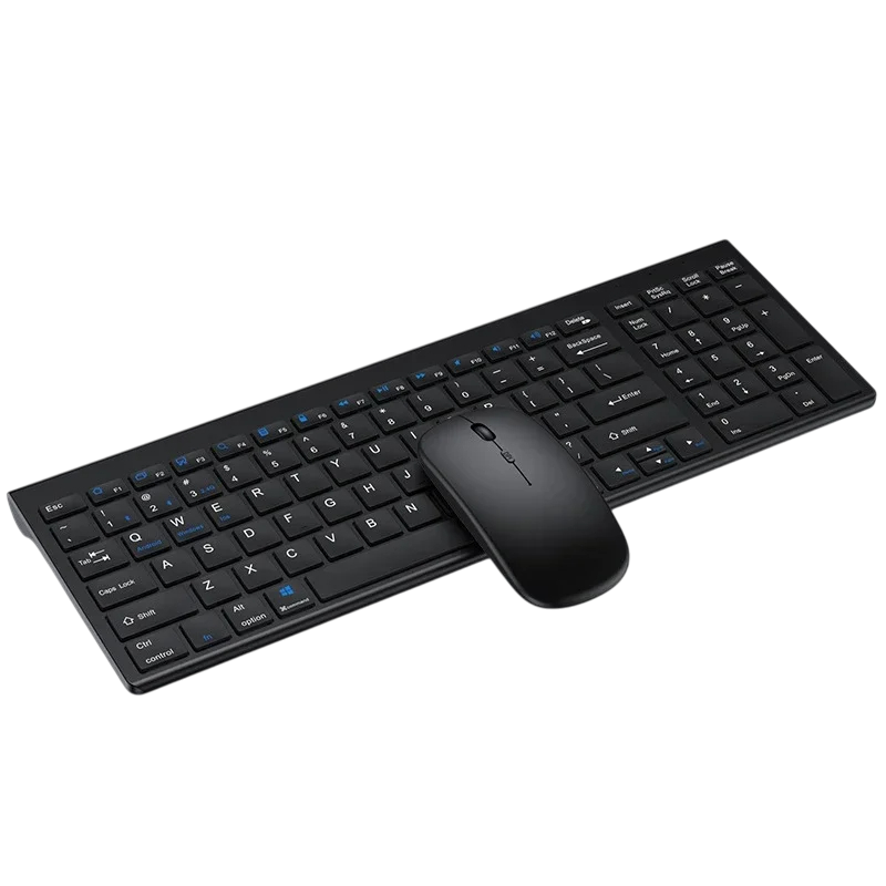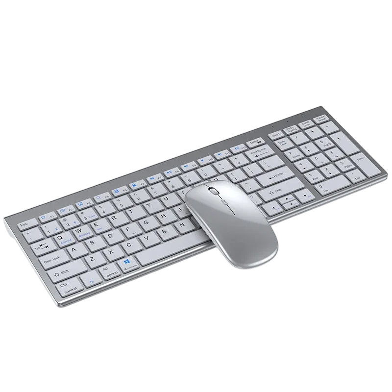 Este conjunto compacto de teclado e rato sem fios é a solução ideal para o controlo confortável do seu portátil, tablet ou computador de secretária. Graças às **baterias recarregáveis via USB**, poupa na constante troca de baterias e pode utilizá-lo também em viagem devido ao seu design compacto. **A ligação sem fios estável 2.4G e Bluetooth** garante uma transmissão de sinal fiável sem interrupções. O teclado tem um funcionamento silencioso e teclas de baixo perfil para uma escrita confortável mesmo durante longas sessões de trabalho. O rato encaixa perfeitamente na mão e também possui botões silenciosos, o que será apreciado não só no escritório.