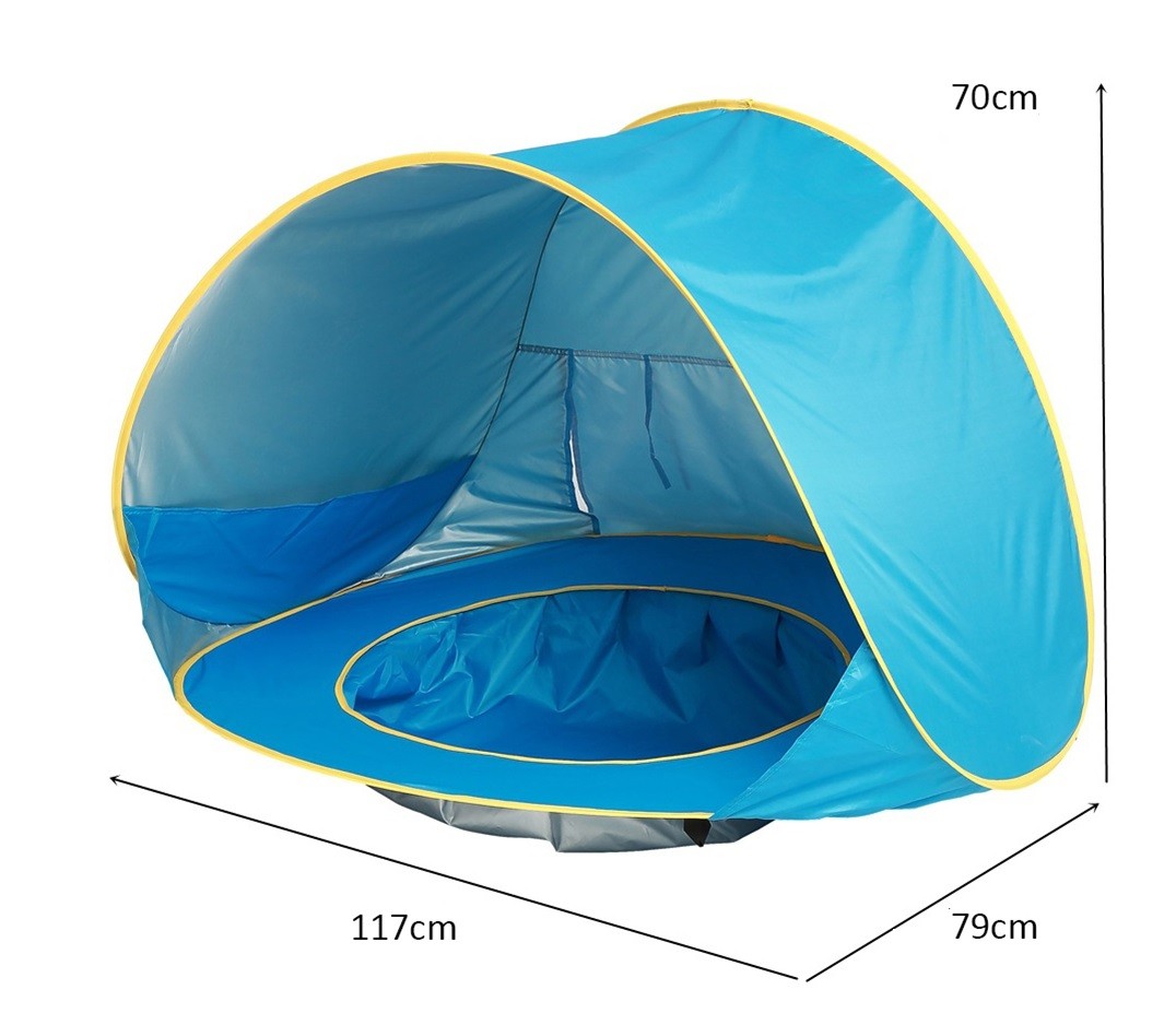 Basta fazer um buraco na areia do tamanho da piscina e depois fixar a tenda com 4 estacas, e o seu pequeno pode divertir-se à beira-mar consigo.