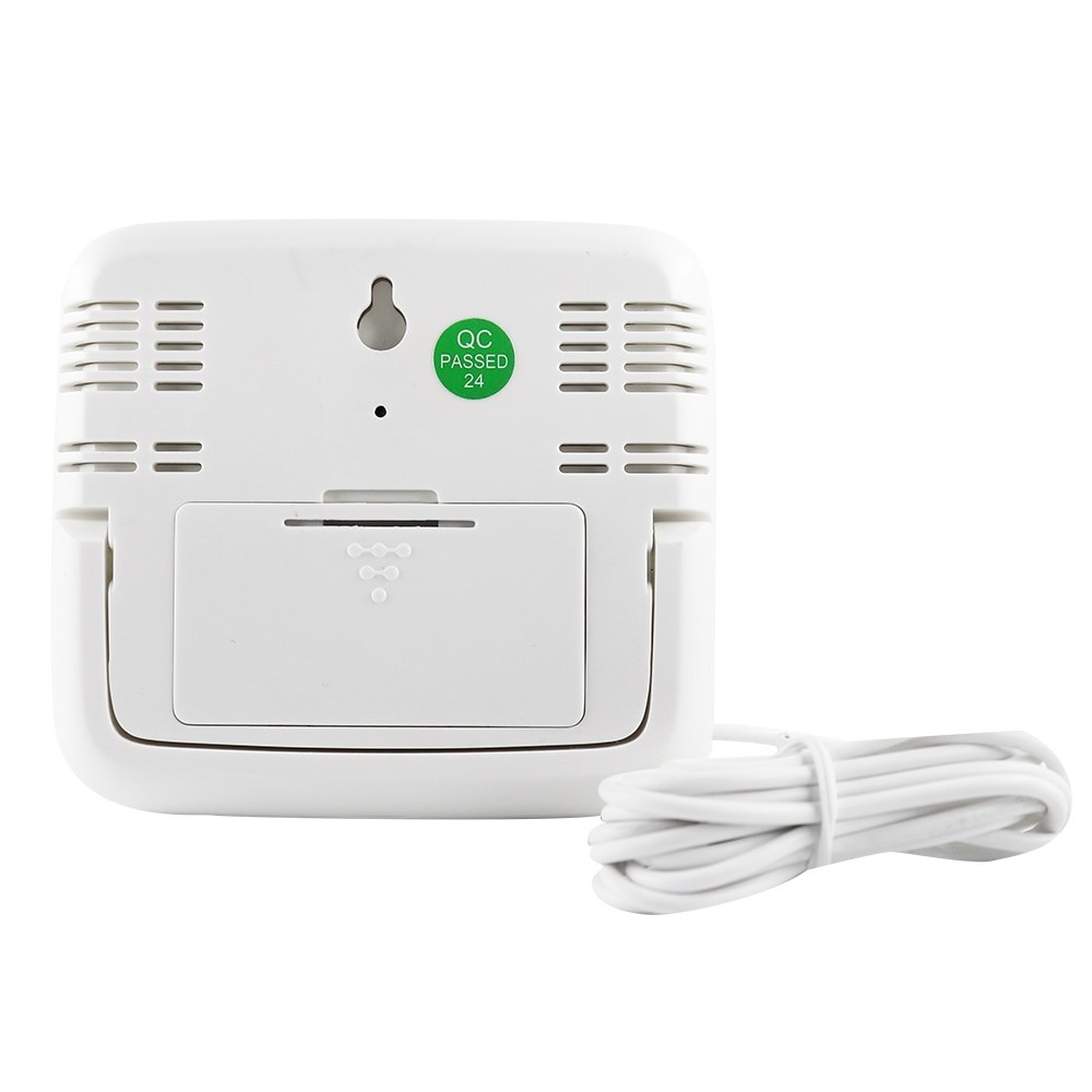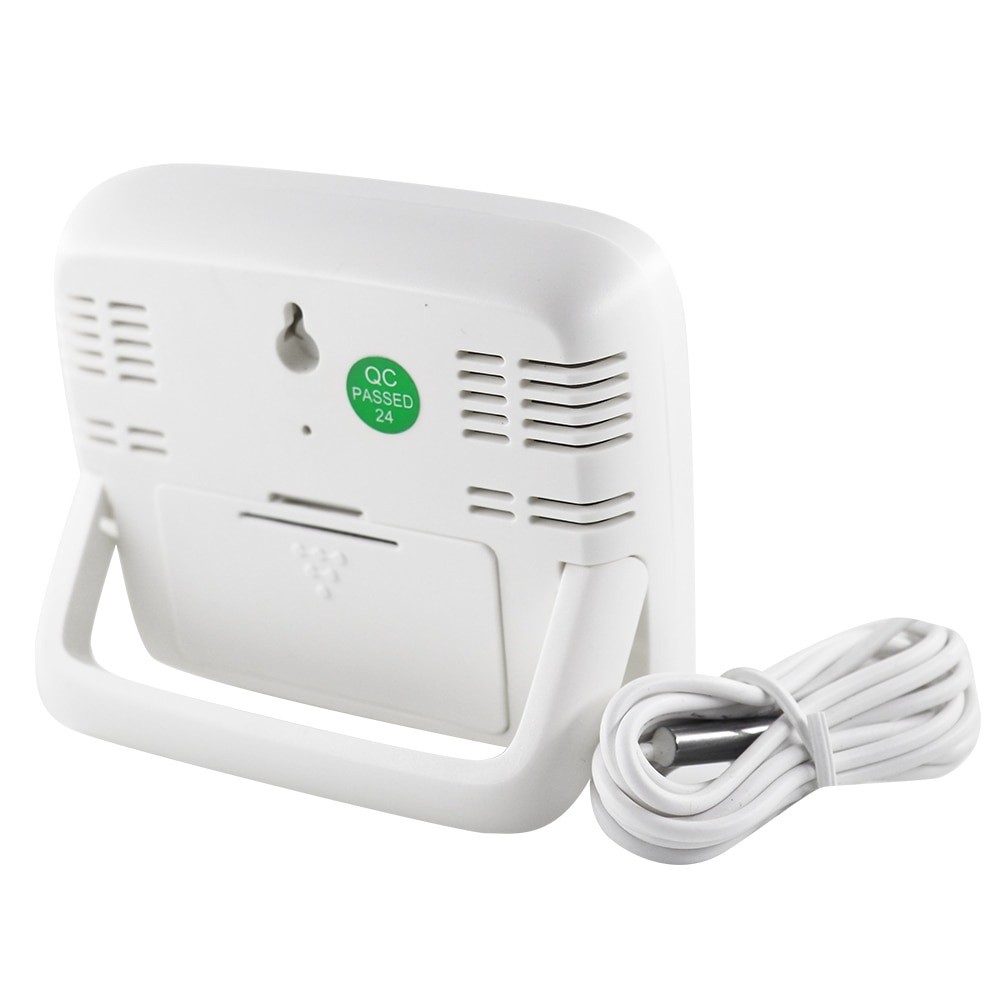 Termómetro digital com sensor externo. Grande e excelente ecrã LCD. Mostra a temperatura (exterior e interior), humidade e hora. Possui uma sonda externa que aumenta a precisão da medição. A temperatura pode ser medida na faixa de - 50 a 70 °C e a humidade com precisão +/- 5 % na faixa de 10 - 99 %. Pode ser colocado em cima da mesa ou na parede.