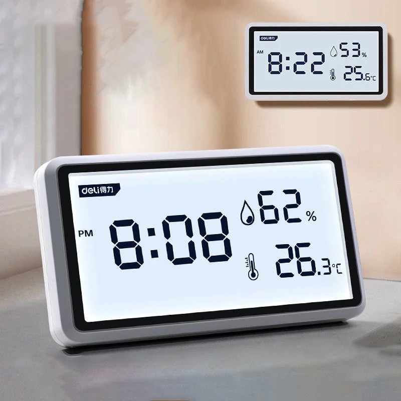 Termómetro digital e higrómetro Deli com função de relógio 4" ecrã LCD Medição altamente precisa Aberturas de ventilação Suporte Ângulo de 53°