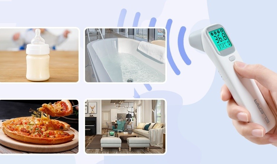 Termómetro infravermelho sem toque. Equipado com ecrã LCD. A cor do ecrã muda de acordo com a temperatura medida. Mede a uma distância de até 3 cm. Resultado rápido em apenas 1 segundo. Alta precisão. Faixa de medição de 32 graus a 42,9 graus. Consegue medir a temperatura do corpo, da água, do leite ou a temperatura ambiente. Histórico de valores medidos com até 40 registos.