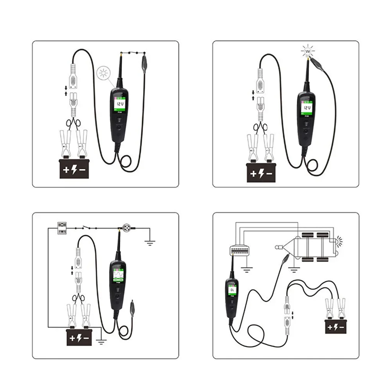 Dispositivo multifuncional para testar baterias e circuitos eléctricos de veículos, com ecrã TFT colorido e sondas de diagnóstico precisas. Descrição completa