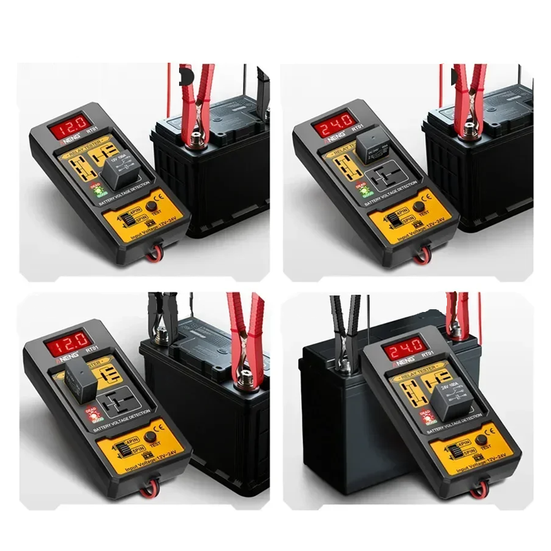 Ferramenta prática para diagnóstico rápido de relés e baterias de automóveis, adequada para sistemas de 12V e 24V, com indicação LED vermelha e verde. Descrição completa