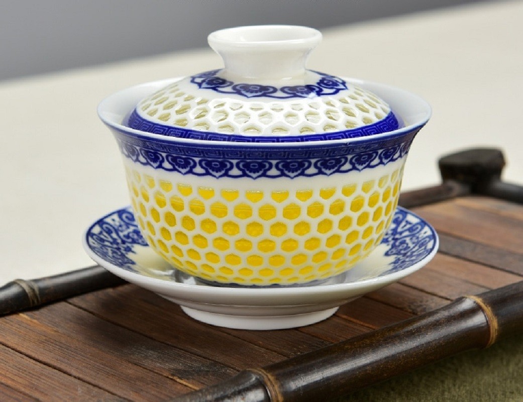 Tigela tradicional chinesa para infusão e consumo de chá com pires.