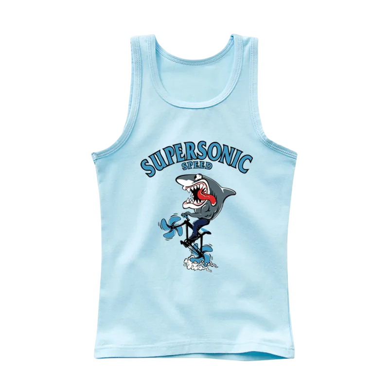 Tílko infantil estiloso em algodão macio com estampado de tubarão. Top leve e respirável, ideal para o verão, brincadeiras e desporto, disponível em várias cores. Descrição completa