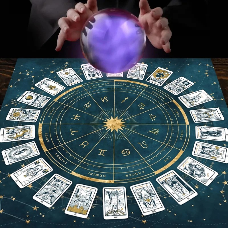 Toalha de tarot maior com símbolos místicos e zodíaco, ideal para leitura de cartas, rituais e prática de meditação. Disponível em várias cores. Descrição completa