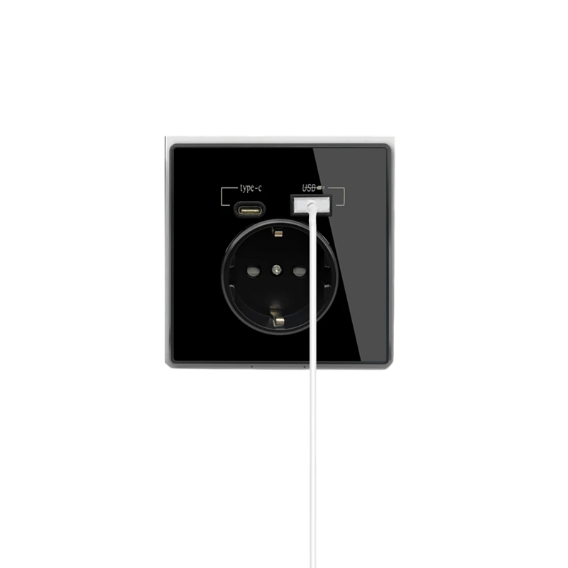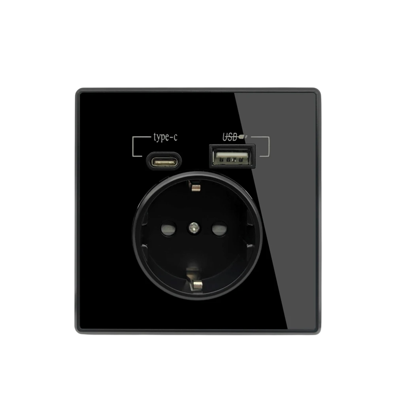 Tomada EU com portas USB C e USB A Luz LED azul 16A adaptador de tomada de parede 5V 2100mA tomada AC universal EU 86x86 mm