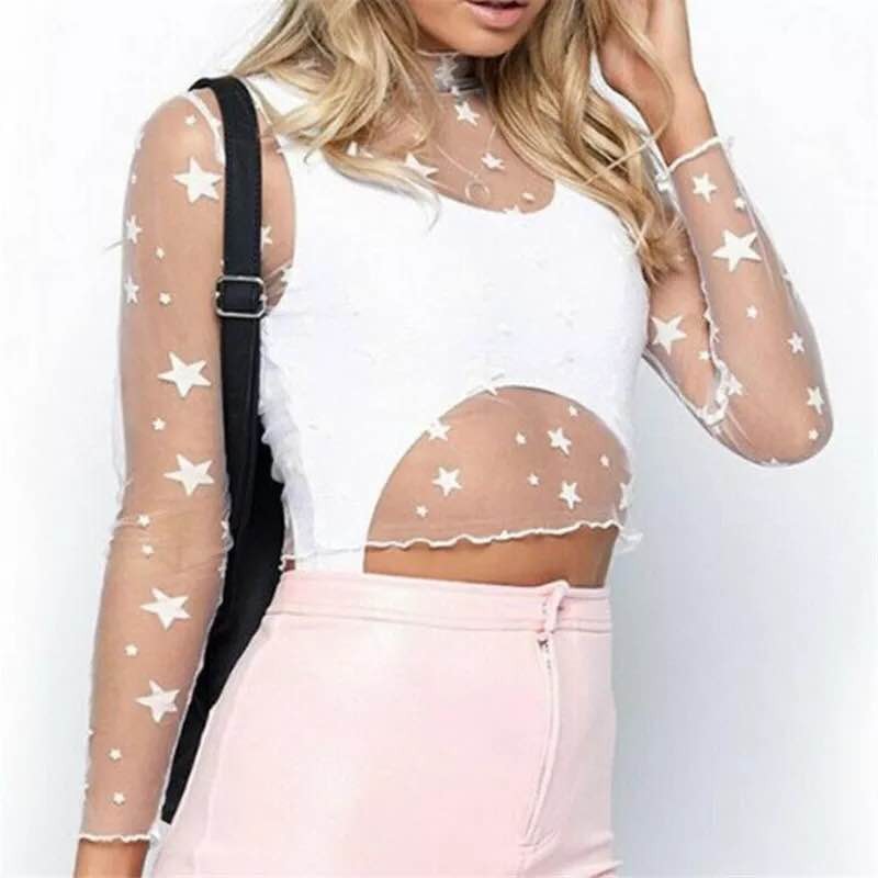 Top crop transparente feminino com estrelas