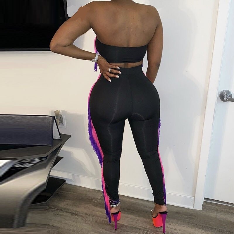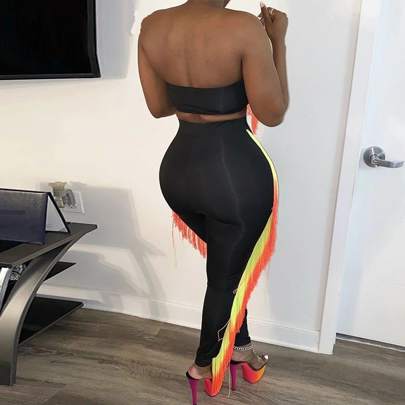 Top cropped feminino e calças com franjas