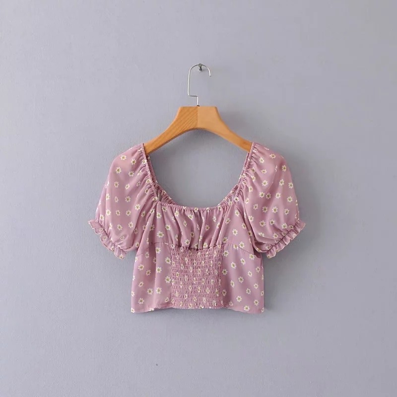 Silhueta justa e mangas curtas ligeiramente volumosas.