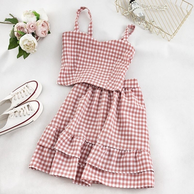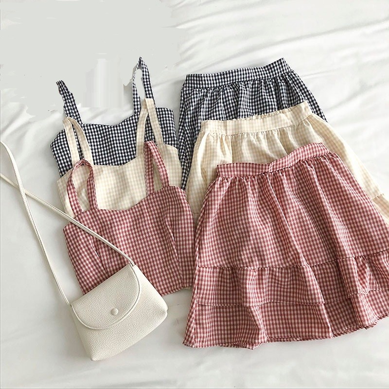 Top cropped xadrez feminino e saia