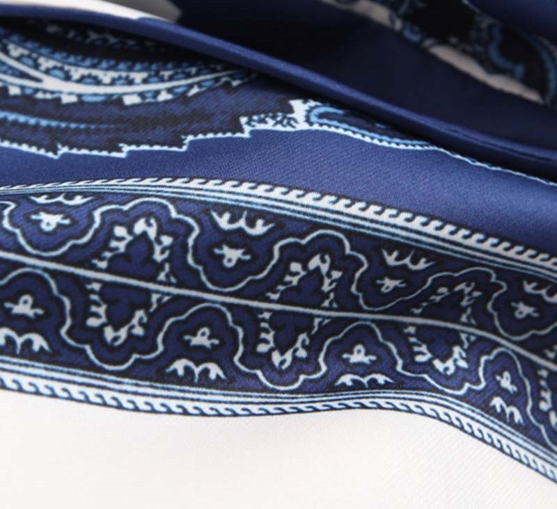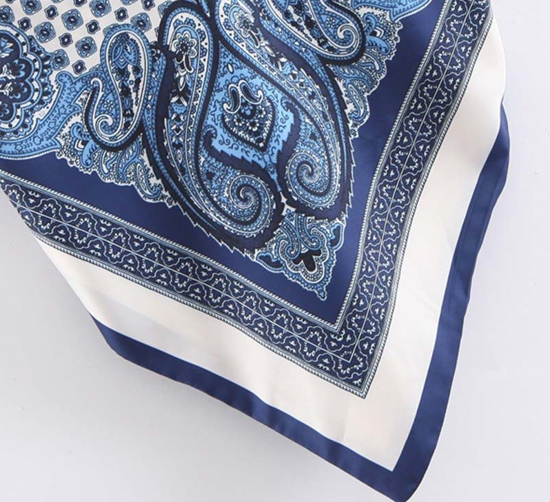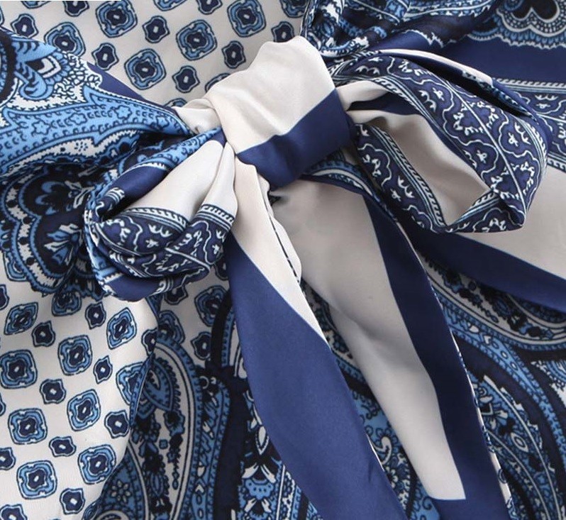 Possui alças finas, padrão de lenço e um simples laço nas costas.