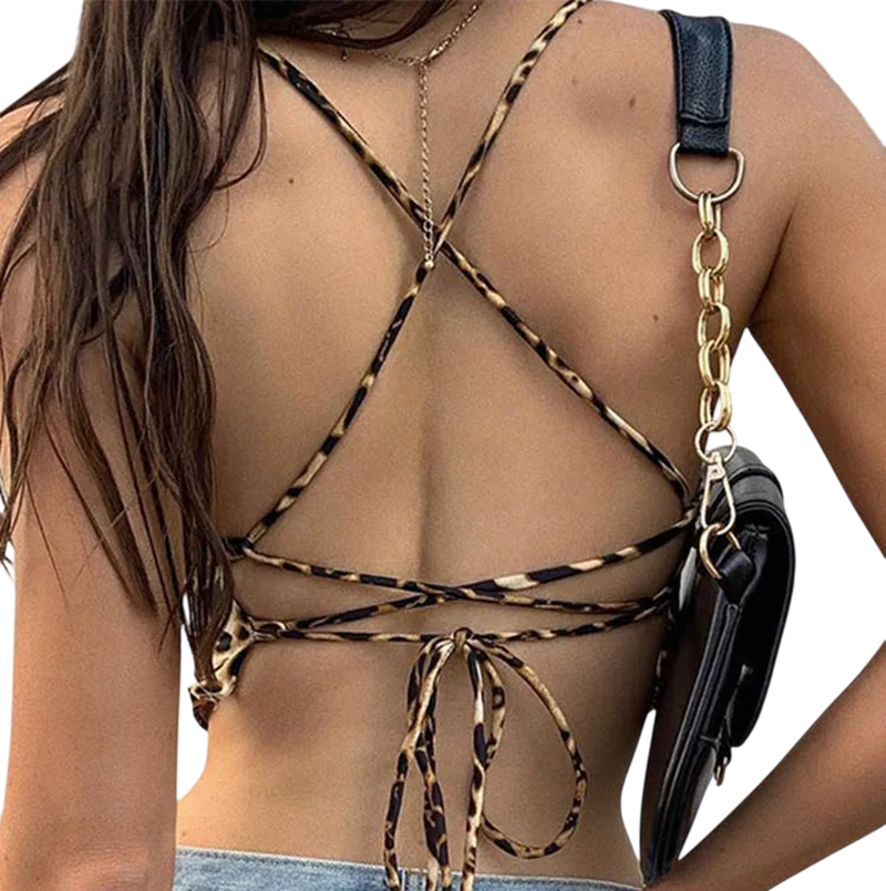 Top feminino estiloso com padrão de leopardo em corte crop, material leve e elástico, tamanho universal, ideal para o verão e a cidade. Descrição completa