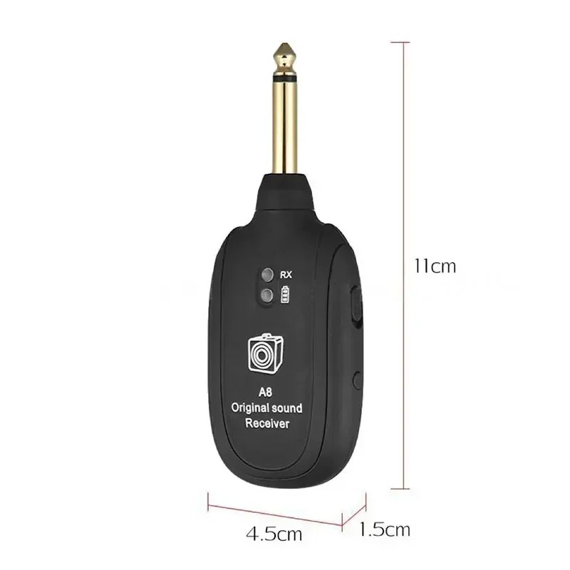 Este transmissor e receptor sem fios A8 é uma solução prática para guitarristas que desejam liberdade de movimento sem a necessidade de usar cabos. Graças à tecnologia sem fios, transmite som entre o instrumento e o amplificador ou pedal sem perda de qualidade. O sistema é compatível com a maioria das guitarras eléctricas, baixos e outros instrumentos com jack de 6,35mm padrão. Design compacto e leve garante transporte confortável diretamente no instrumento sem limitar o movimento. A instalação é fácil – basta ligar, emparelhar e começar a tocar.