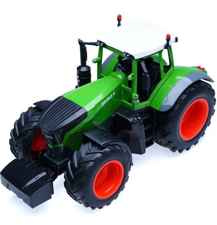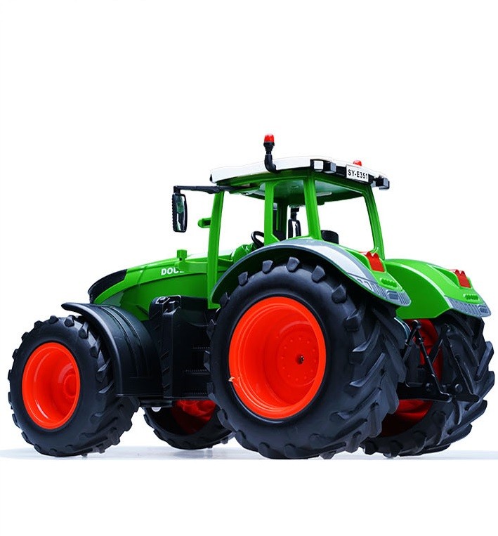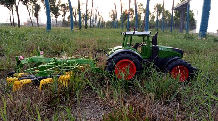 O trator tem um virador de feno atrelado, que servirá como uma ótima diversão ao ar livre na relva cortada.