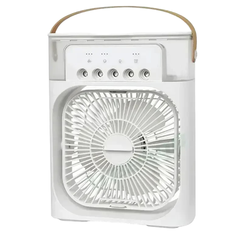 Este ventilador portátil com luz LED e humidificador de ar é não só prático, mas também um acessório estiloso para a sua casa ou escritório. O tamanho compacto e o design leve permitem fácil transporte, para que o possa ter sempre à mão, onde quer que esteja. A função do ventilador proporciona um refresco agradável, o humidificador de ar melhora a qualidade do ar e o ar condicionado traz frescura em dias quentes.