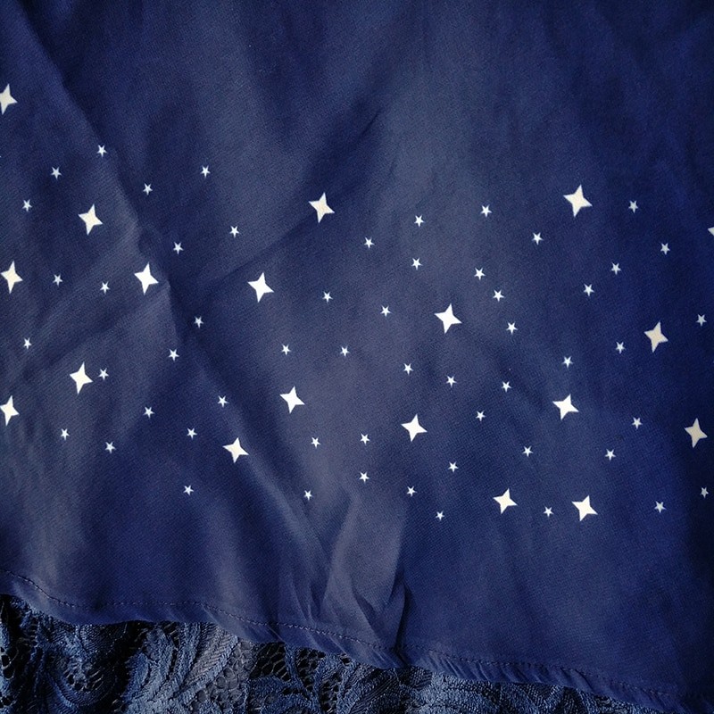 Volante assimétrico com delicada estampa de estrelas e adornos em renda.