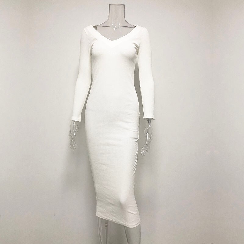 Vestido midi bodycon feminino em malha com ombros caídos.