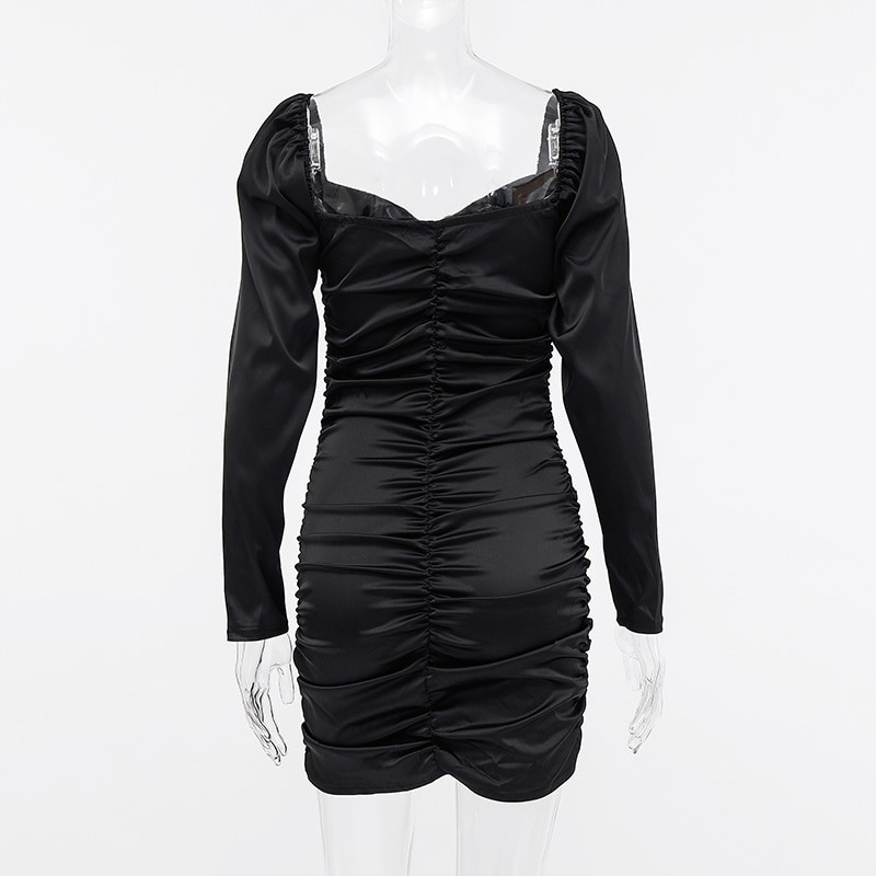 Luxuoso vestido mini em material liso e brilhante com mangas largas.