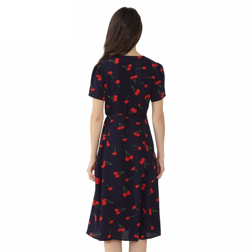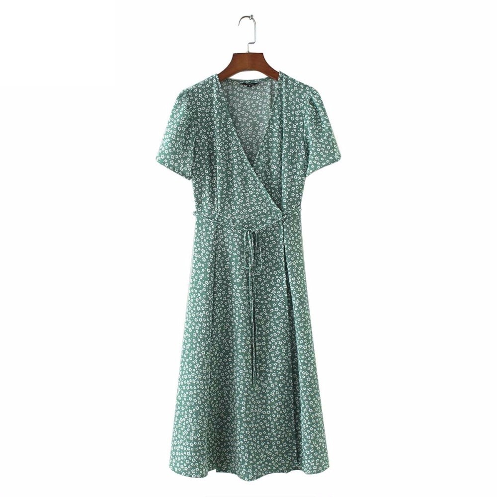 O vestido tem mangas curtas e decote em V.