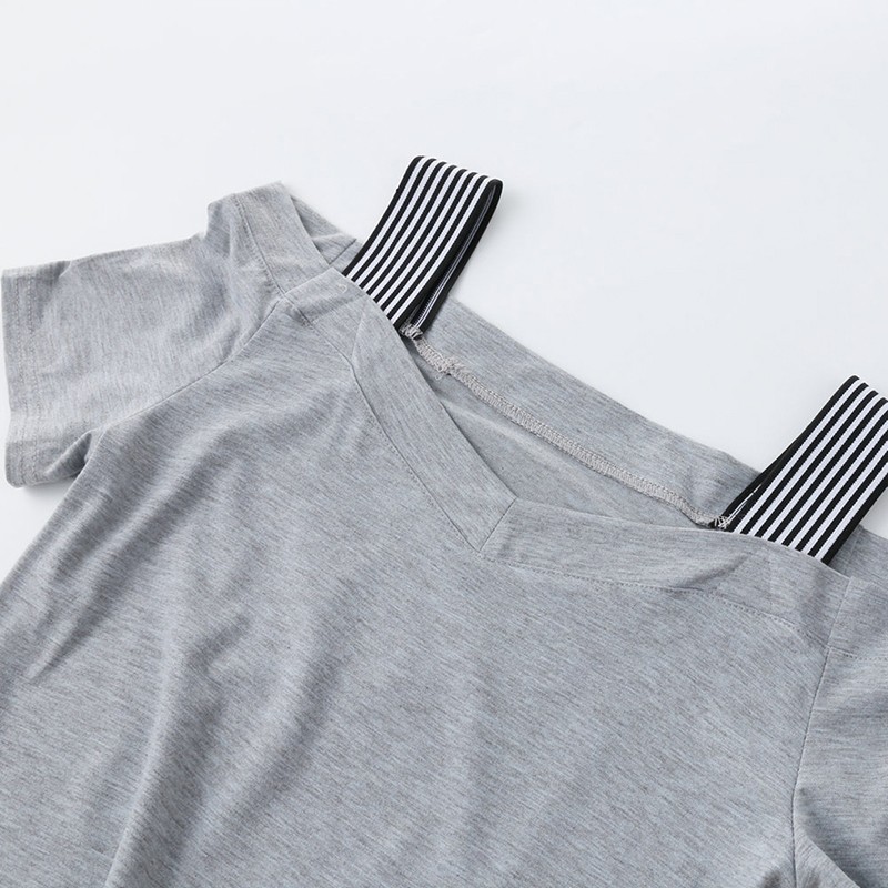 Vestido mini cinza para senhora com decote largo e alças contrastantes.