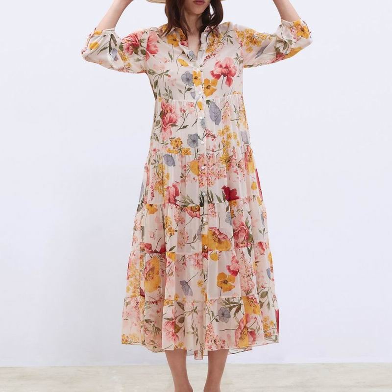 Vestido feminino de manga longa. Estampado floral e colarinho clássico.
