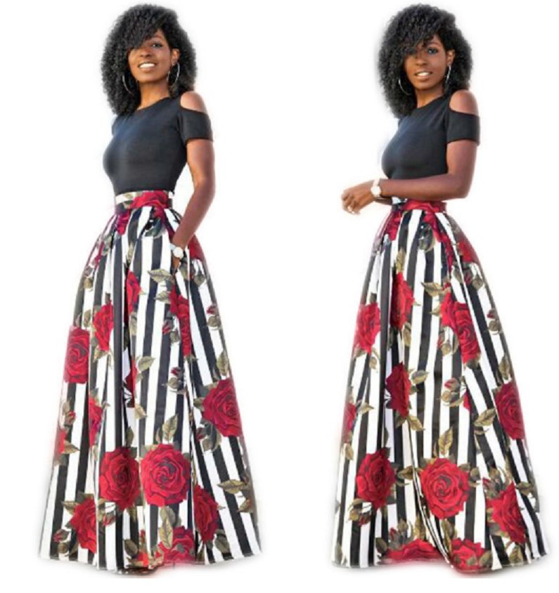 A primeira é um top preto com buracos nos ombros e a segunda é uma saia longa floral.
