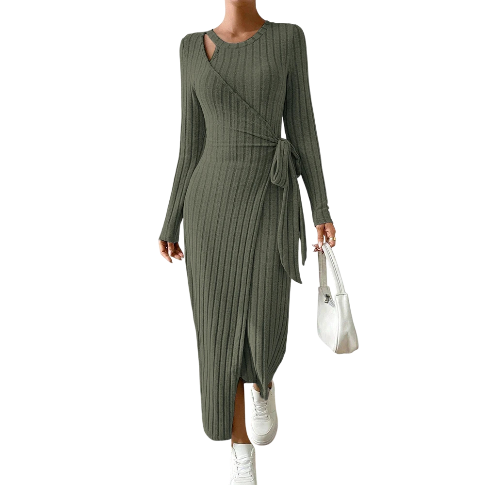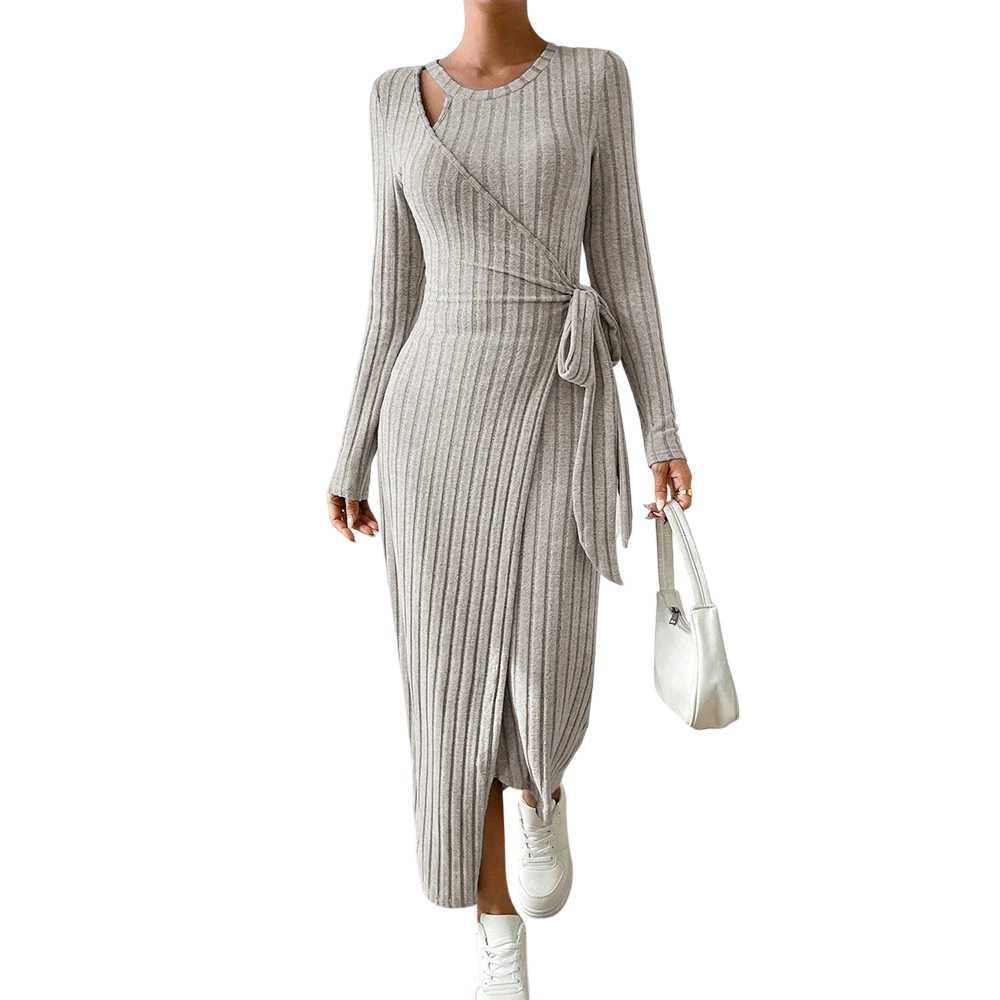 Vestido de malha elegante com cinto e fenda, que realça a silhueta. Ideal para combinações estilosas de outono e primavera. Descrição completa