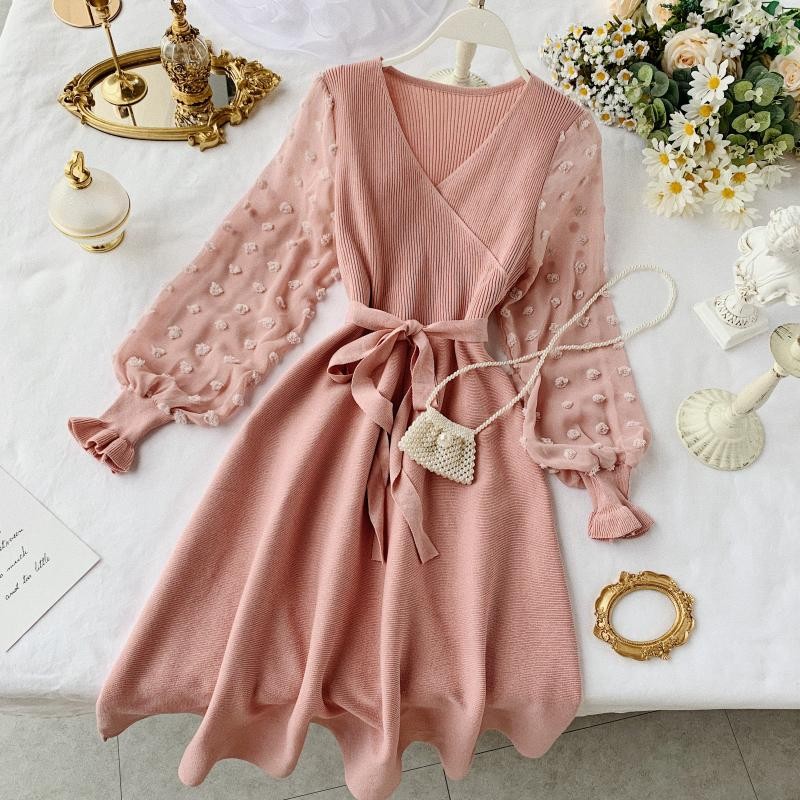 Vestido de malha feminino de outono com saia alargada e mangas.