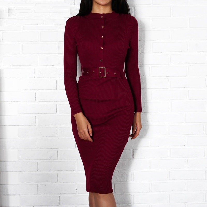 Vestido de malha feminino com mangas longas e cinto da moda.