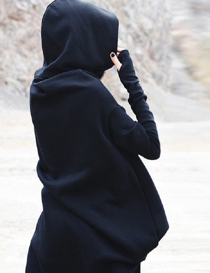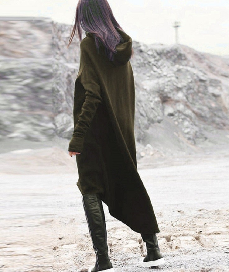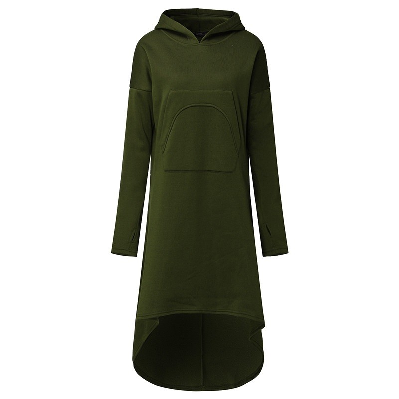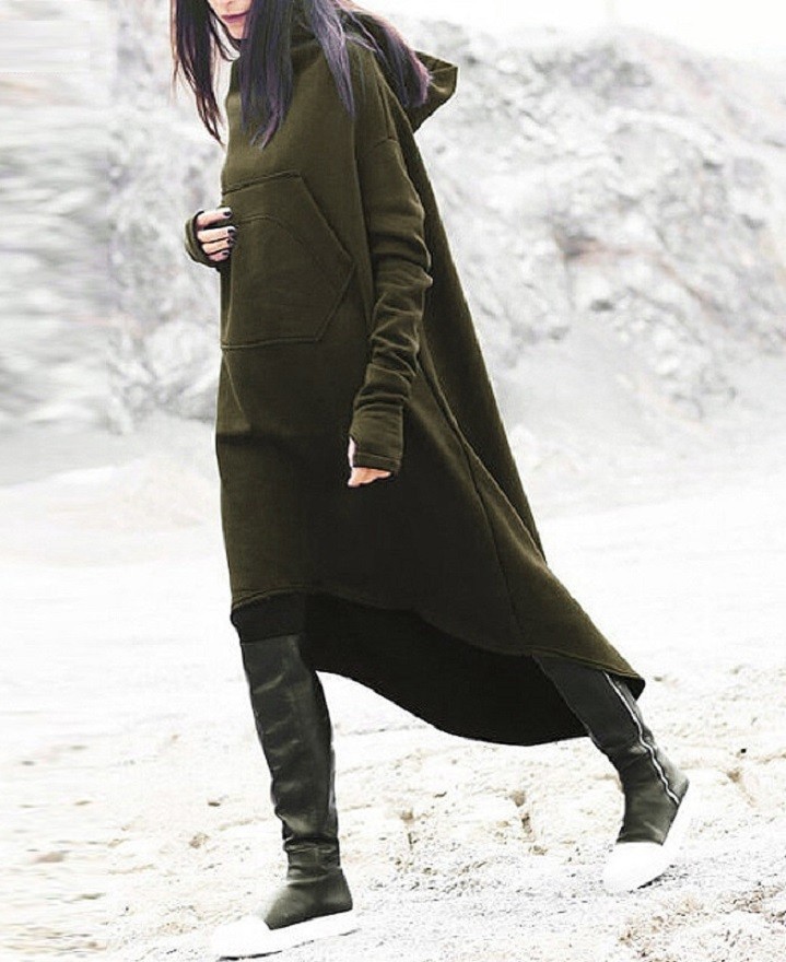 Estiloso vestido de moletão de outono com mangas longas e capuz.