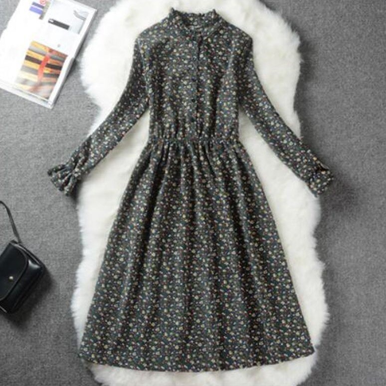 Bonito vestido de outono com mangas longas e gola alta.