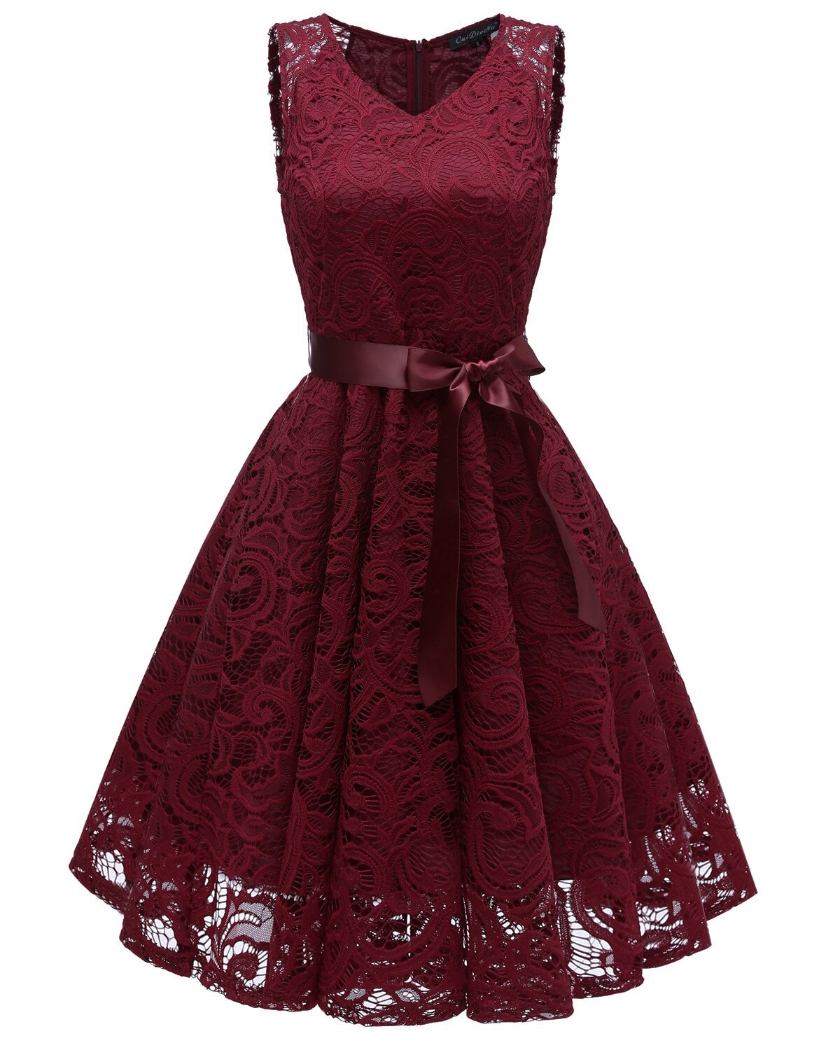 O vestido é todo coberto de renda. Na cintura, é adornado com um laço.