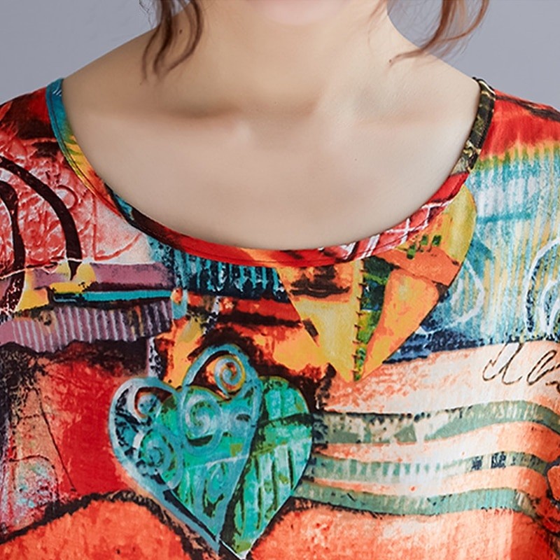 Um simples decote redondo e um estampado abstrato marcante.