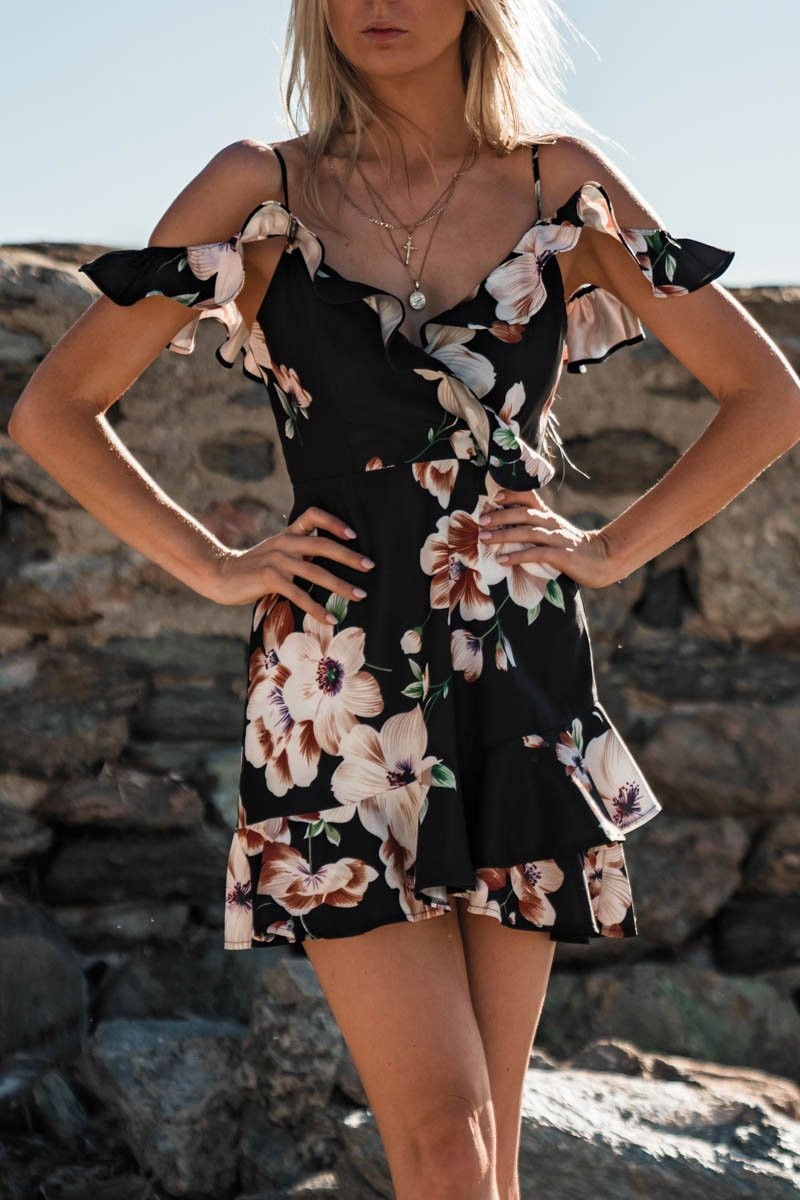 Padrão floral romântico, saia com volantes.
