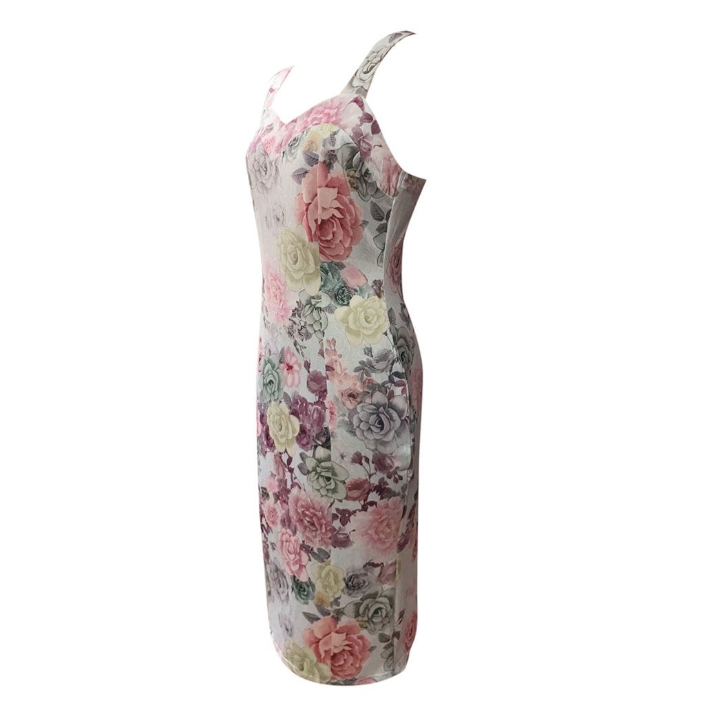 Vestido elegante de alças com comprimento abaixo do joelho.