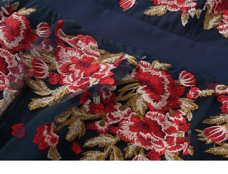 Decote redondo clássico e bordado em contraste.