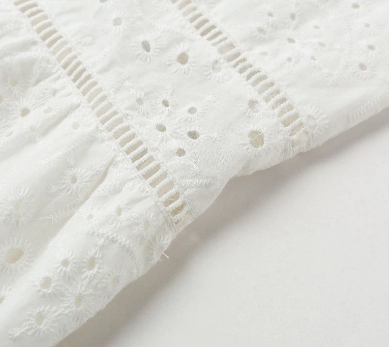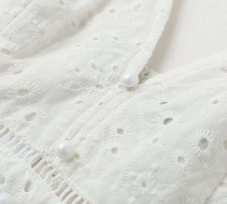 Longo vestido de verão com uma encantadora bordadura. Decorado com pérolas.